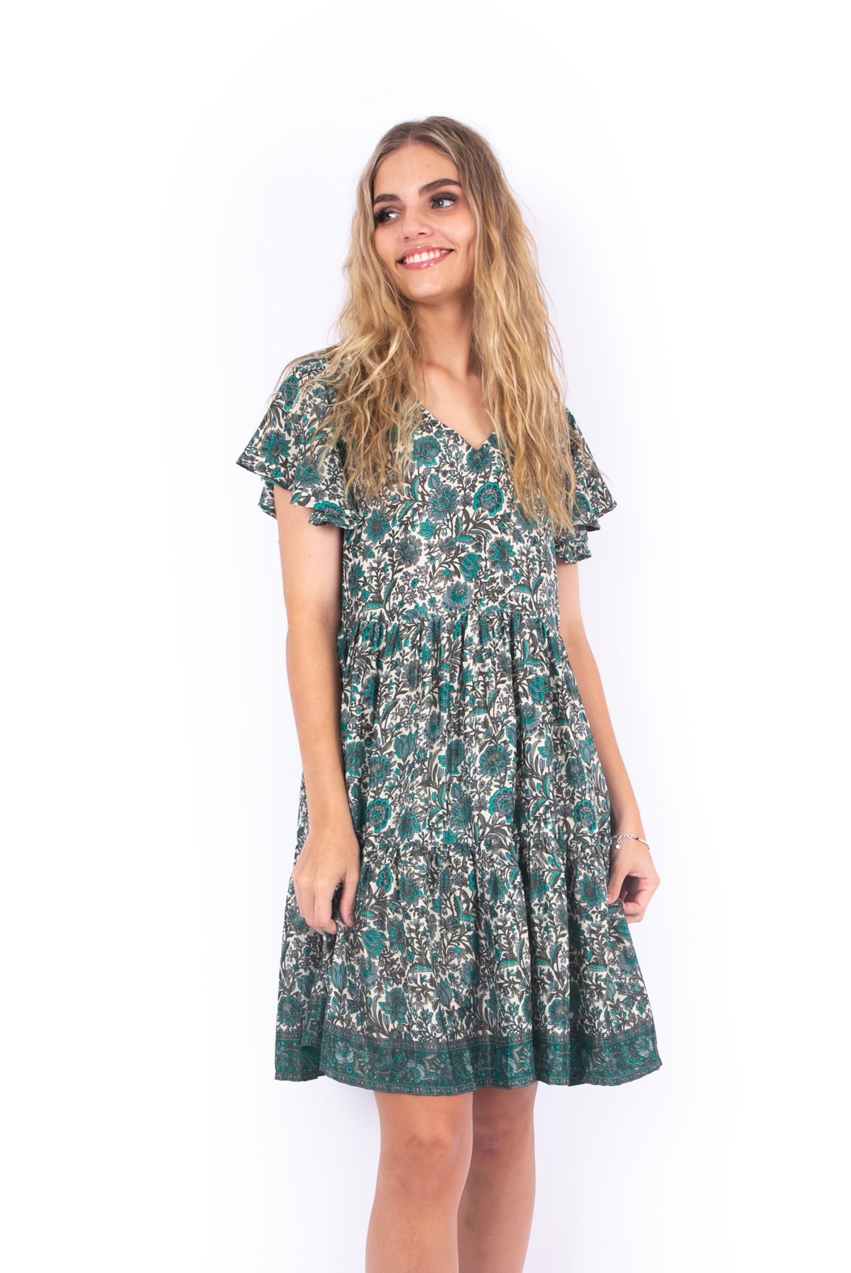 The Ava Dress is a loose easy fit. It’s comfortable, light and beautiful. Featuring a V neck, flutter sleeves and a classic tiered dress shape. The Ava dress is such a fun and easy summer dress! This Ava Dress is made using a beautiful light weight polysilk sari fabric.