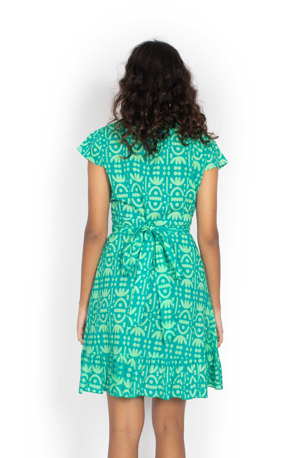 The design of the women’s Frill Wrap Dress has been perfected over the years, fitting the body like a glove. It wraps comfortably and perfectly. It has cute cap sleeves and is designed to be tied at the back but can also be tied at the side or front. This cotton wrap dress is perfect for every shape and size.