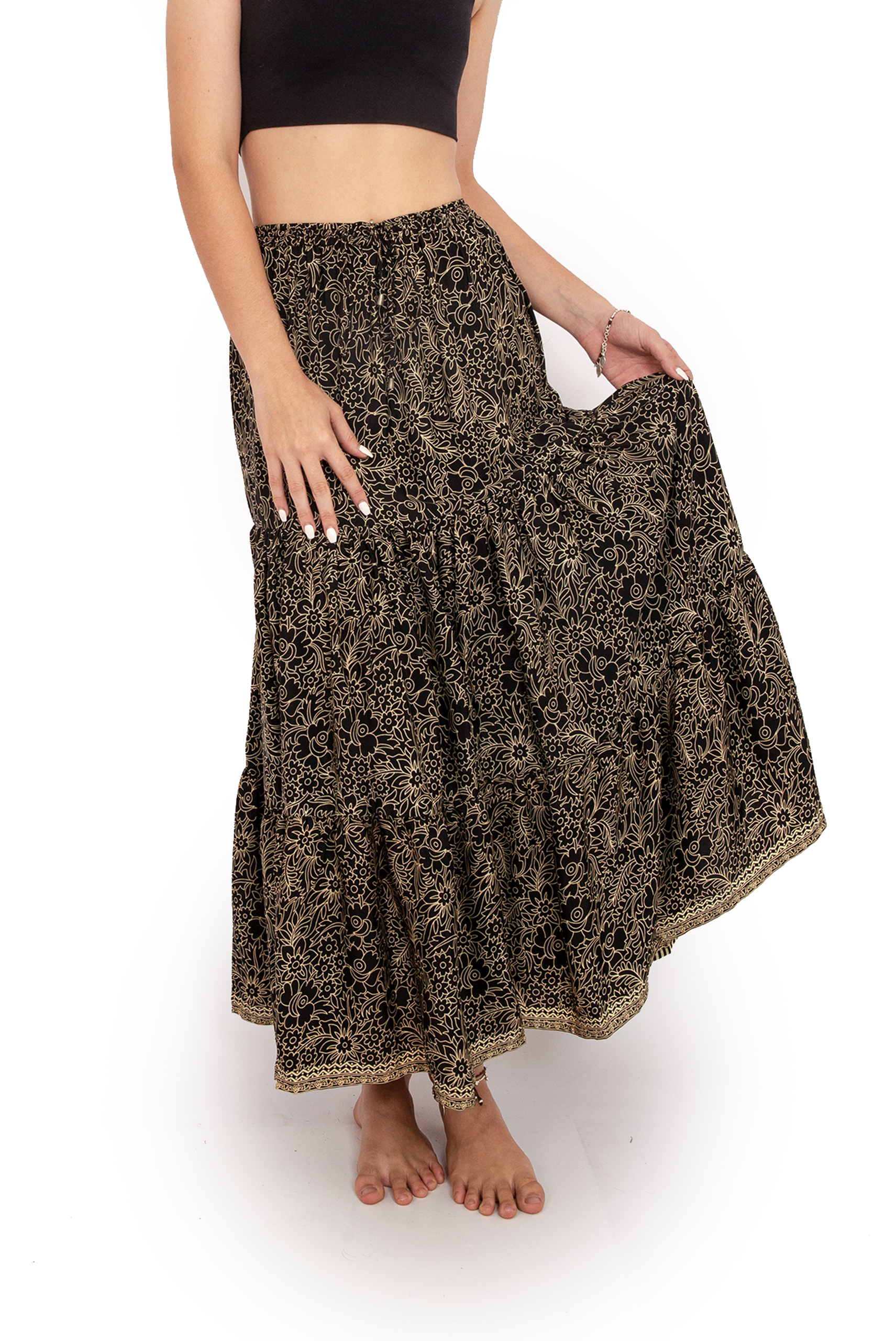 Our Isabella Skirt in Black polysilk sari fabric has an elastic waist and is so comfortable and stylish!