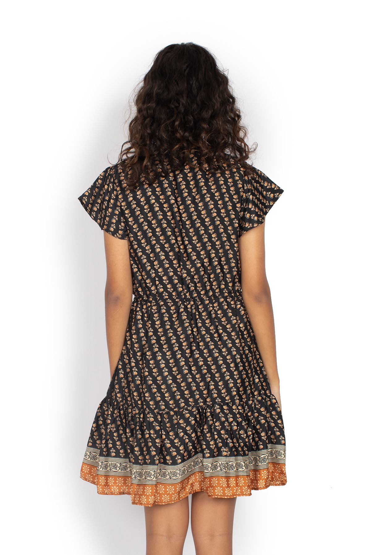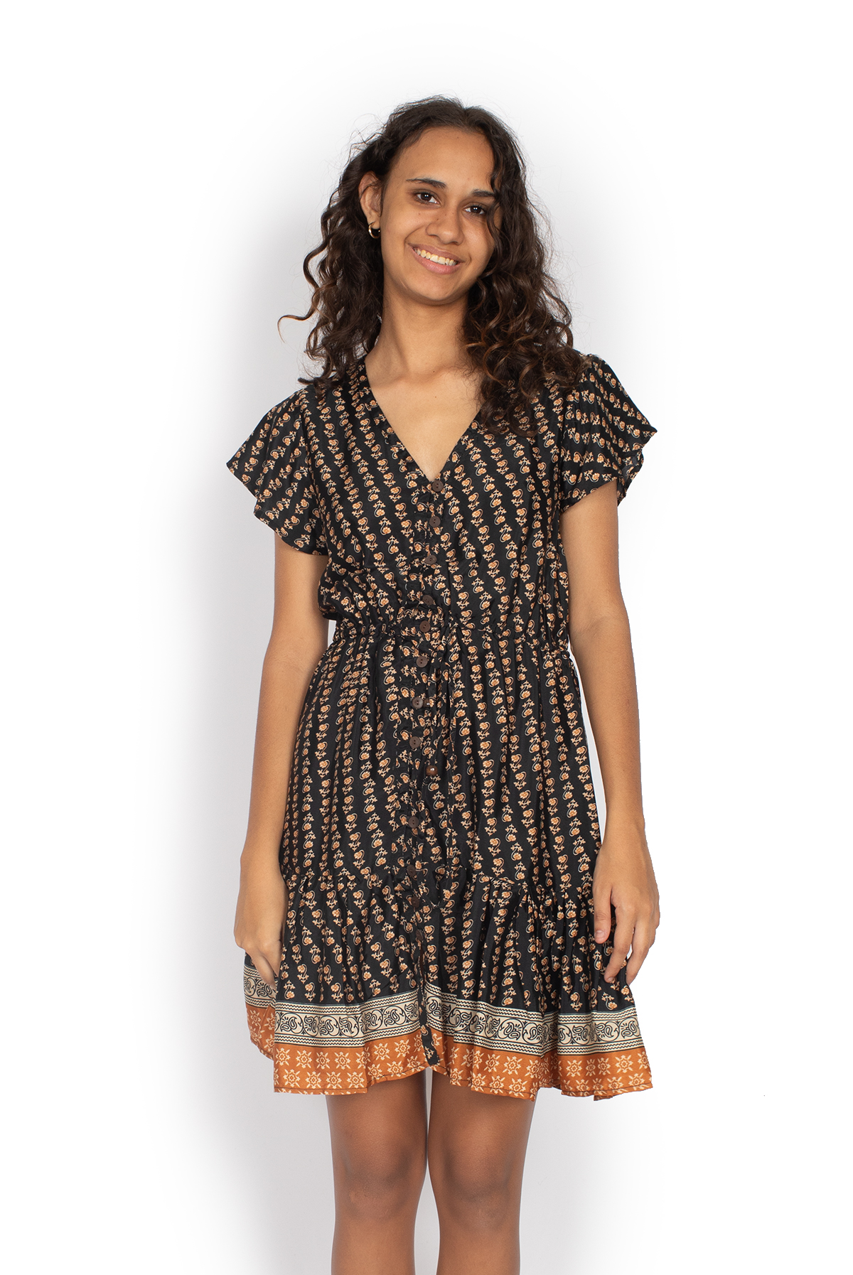 Flirty and feminine, this day to night beauty is a summer essential. Made using super soft, light weight polysilk sari fabric, with cute flutter sleeves, coconut buttons, an elastic tie-waist and beautiful border print detailing.