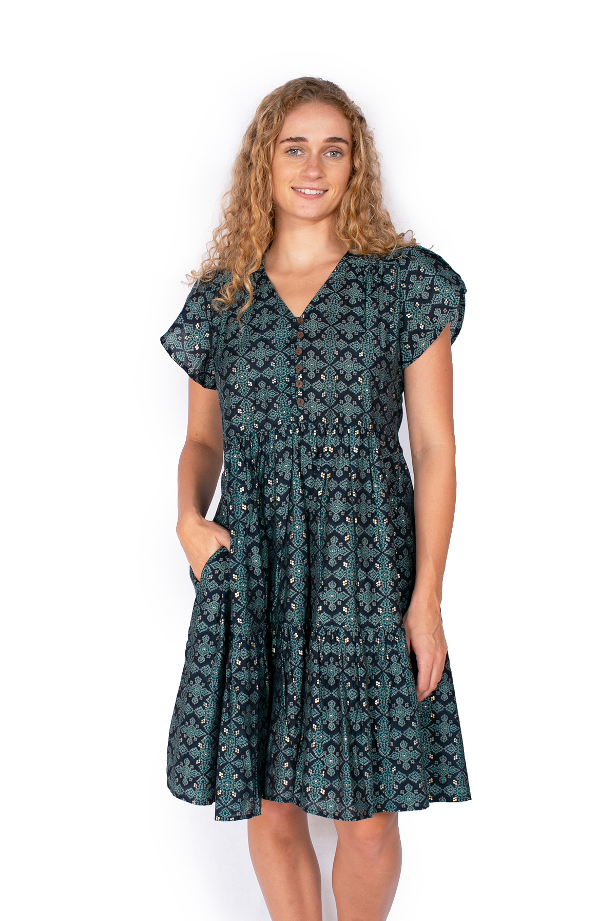 You will love our super popular Sasha Dress! Made using beautiful soft and light polysilk sari fabric and featuring coconut buttons, short flutter sleeves and a tiered dress shape. It’s sure to become your summer favourite!
